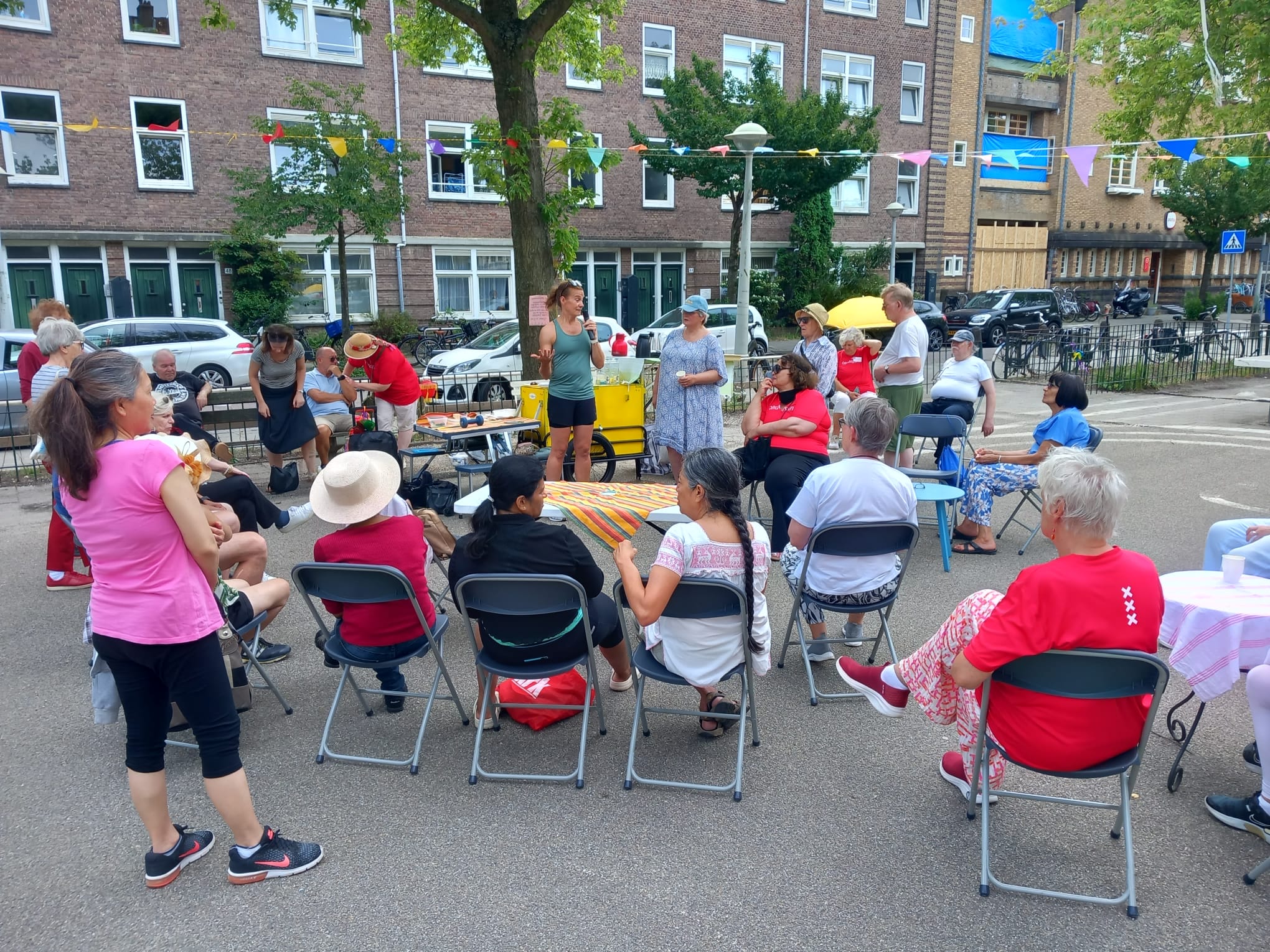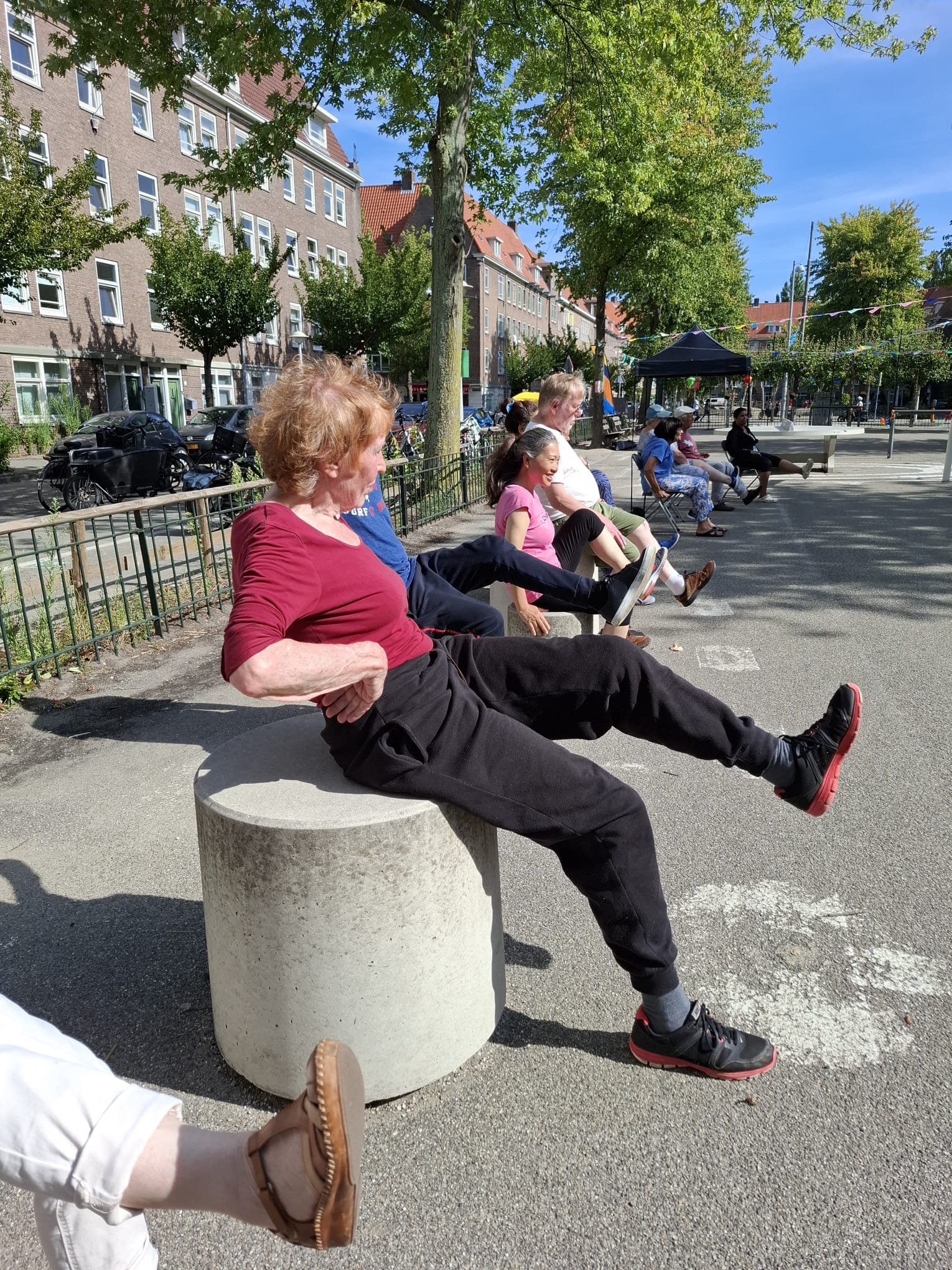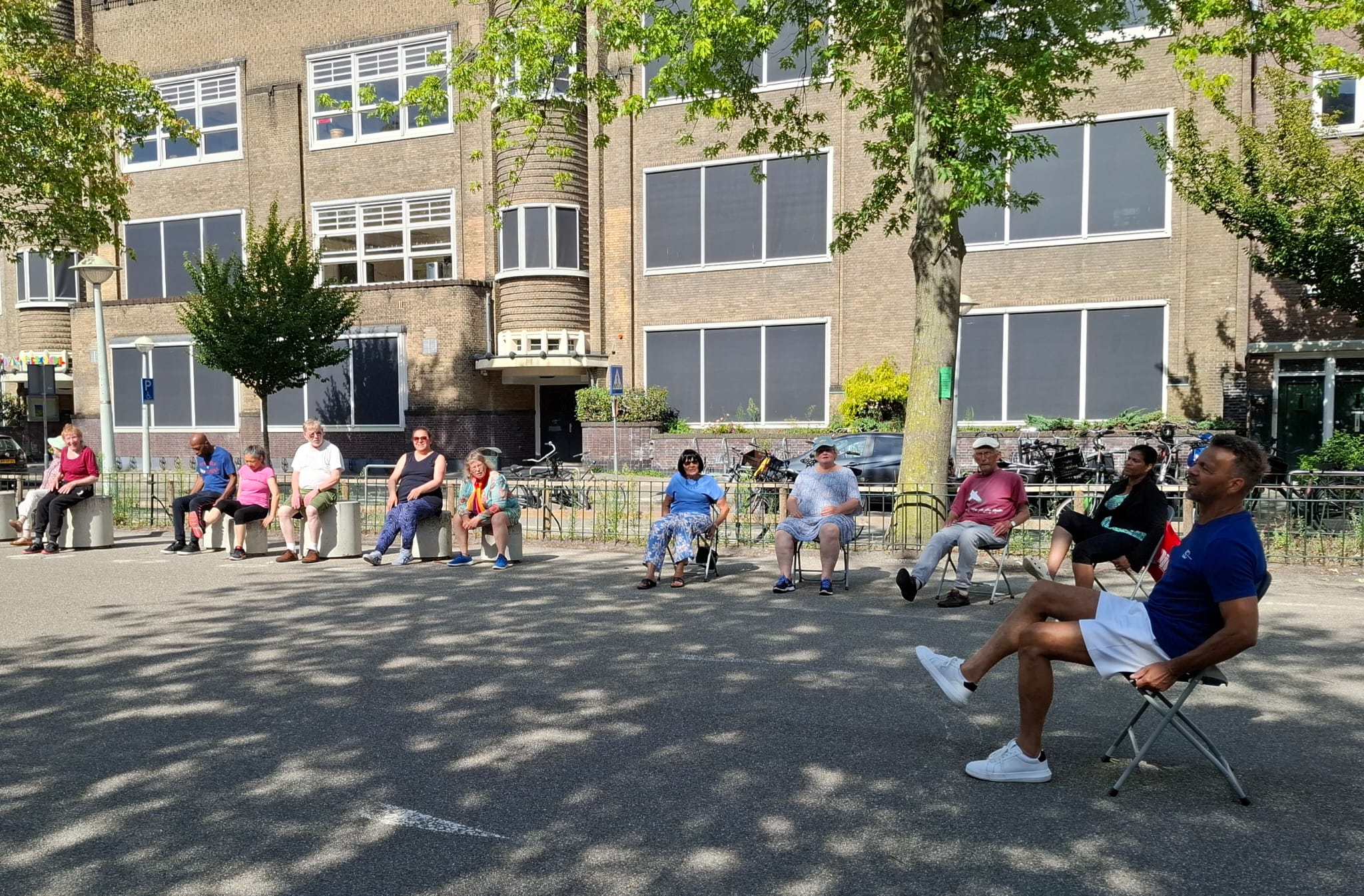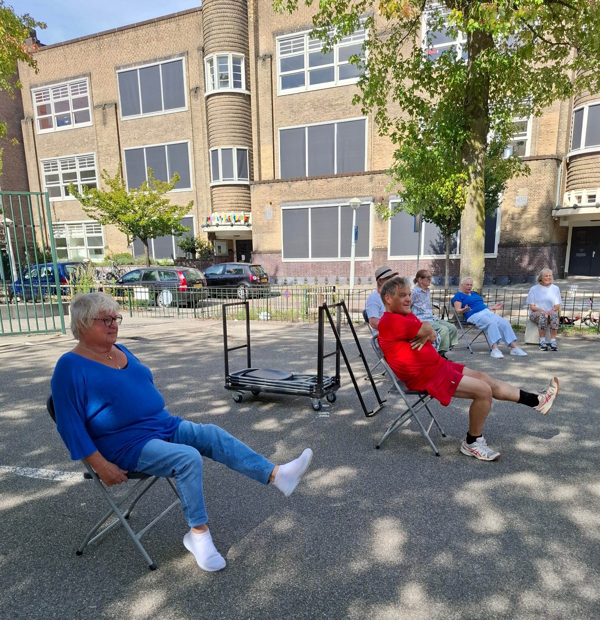 Rond 10 uur kwamen de eerste mensen. Iets na 1/2 elf arriveerde de docent en konden we met het bewegen beginnen. Het was lekker druk en door de warmte deden we rustige oefeningen. Na de warming up een stukje verplaatst en op stoelen en kolommen hebben we een soort stoelgym gedaan.