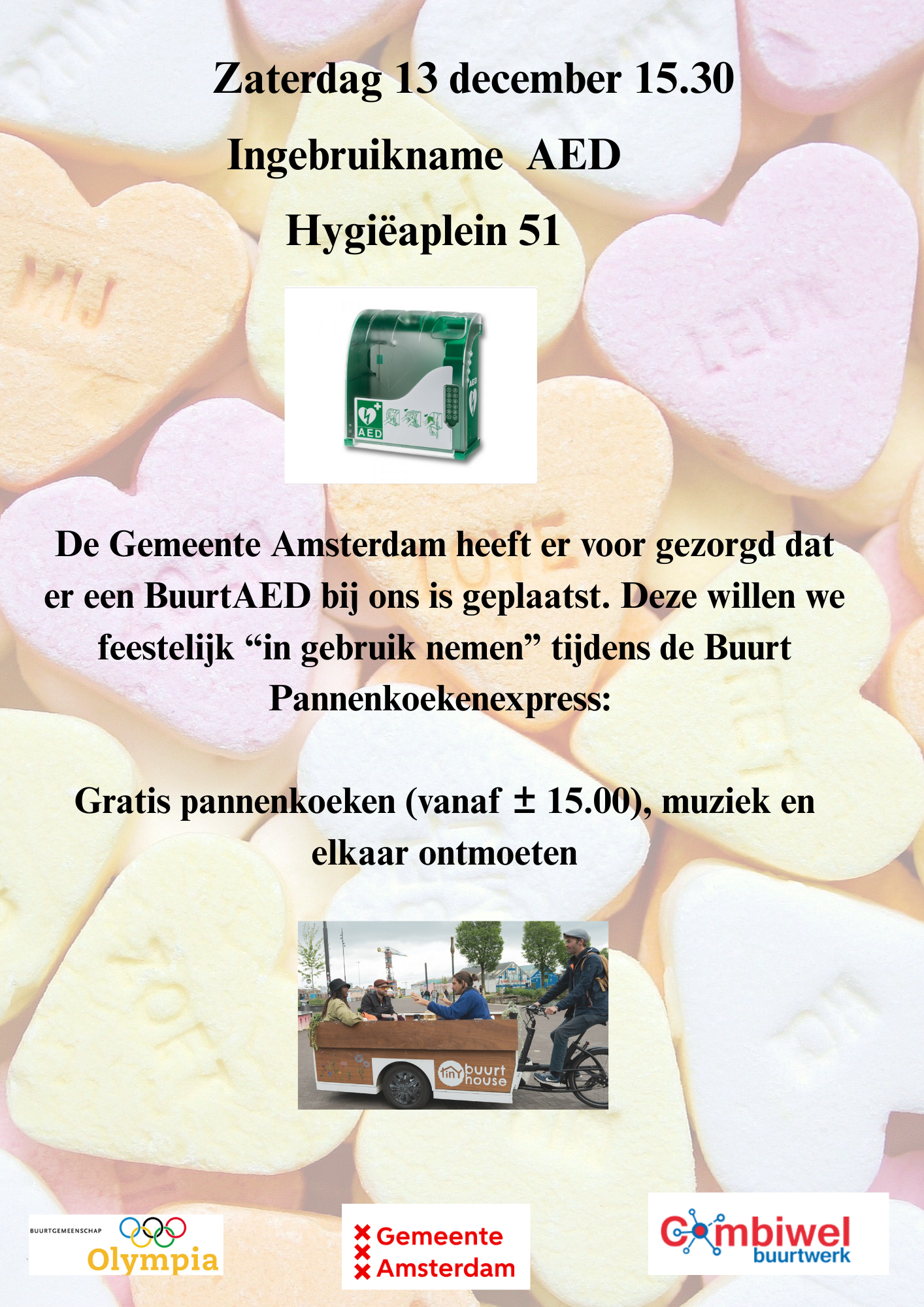 Er wordt gestart rond 12 uur tegenover Stadionplein 65 (onder de luifel). Rond 15 uur wordt het Hygiëaplein bereikt. Vanaf 15.30 uur wordt er aandacht besteed aan de buurt AED bij Hygiëaplein 51.