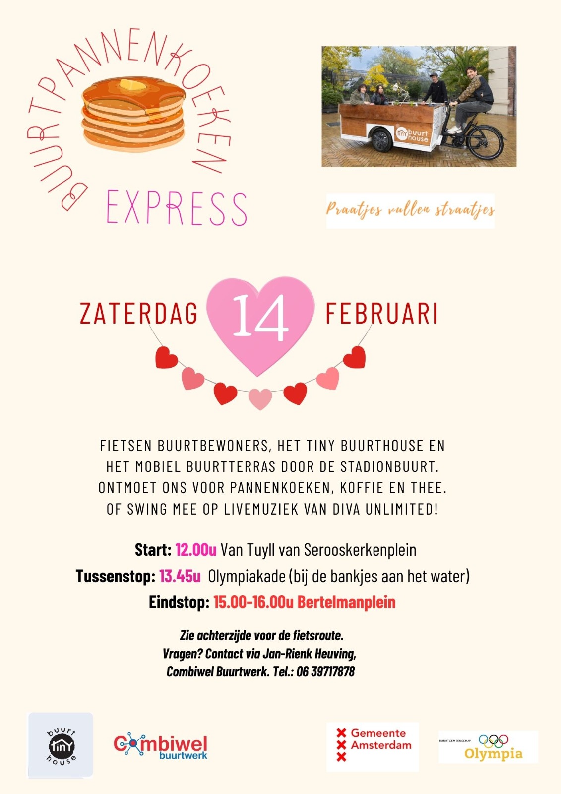 Op zaterdag 14 februari trekt de Buurtpannenkoeken Express door de Stadionbuurt! Samen met buurtbewoners, het Tiny Buurthouse en het mobiele buurtterras fietsen we door de wijk voor ontmoeting, gezelligheid en natuurlijk: pannenkoeken.
