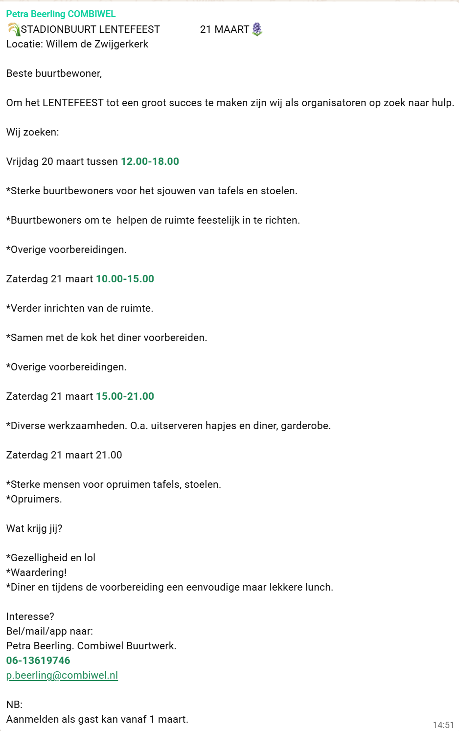 We zoeken nog vrijwilligers voor de opbouw, tijdens het feest en bij de afbouw. Hoe meer helpende handen, hoe gezelliger en makkelijker het wordt! Interesse? Meld je aan bij Petra Beerling dan wel bij het Stadsdorp (info@stadsdorp-olympia.nl) André Voskamp (06) 14 87 53 54