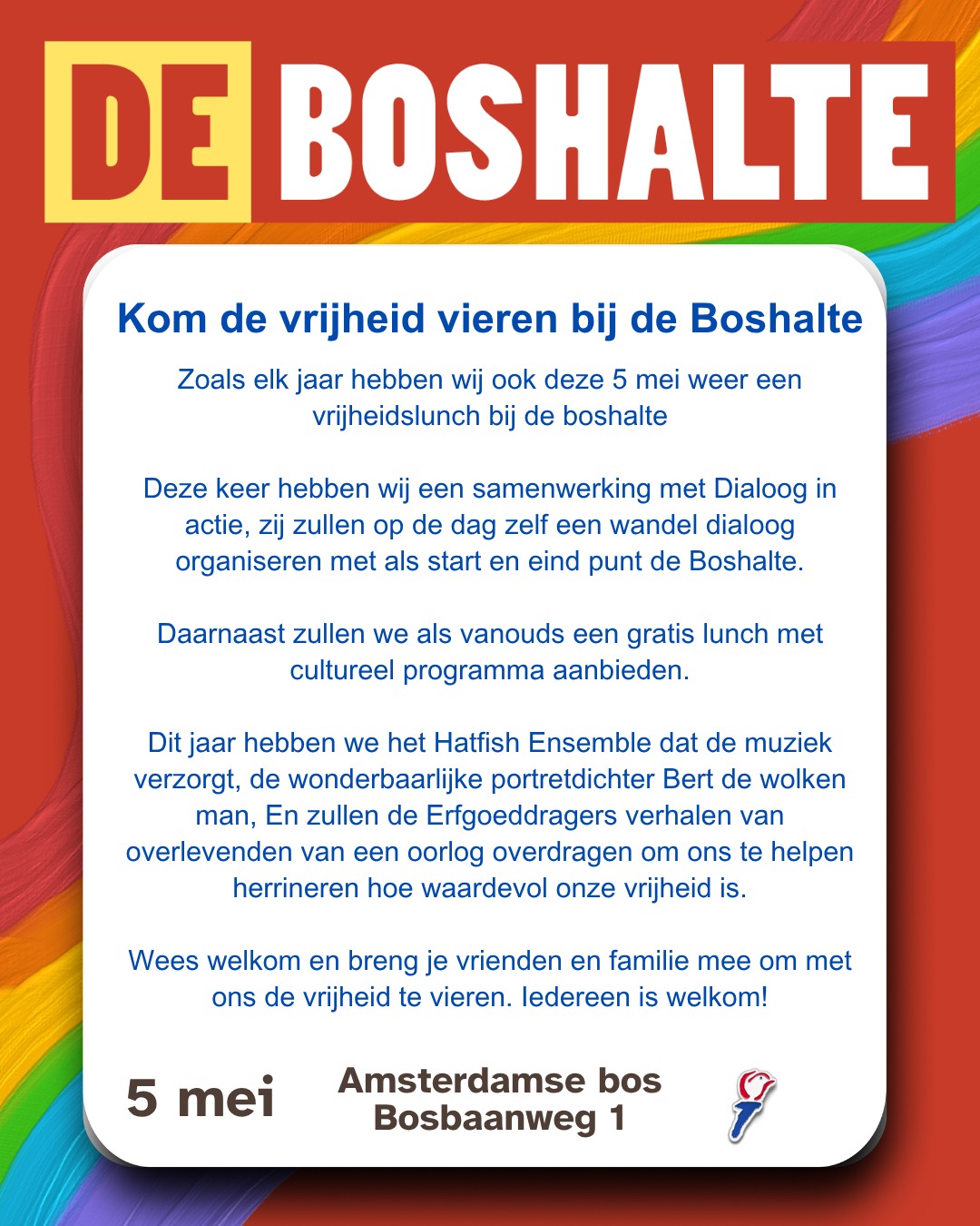 Na de wandeling kun je aansluiten bij de vrijheidsmaaltijd van stichting de Boshalte (vanaf 12:00, soep tot 16:00). Daarnaast is er van alles te beleven: